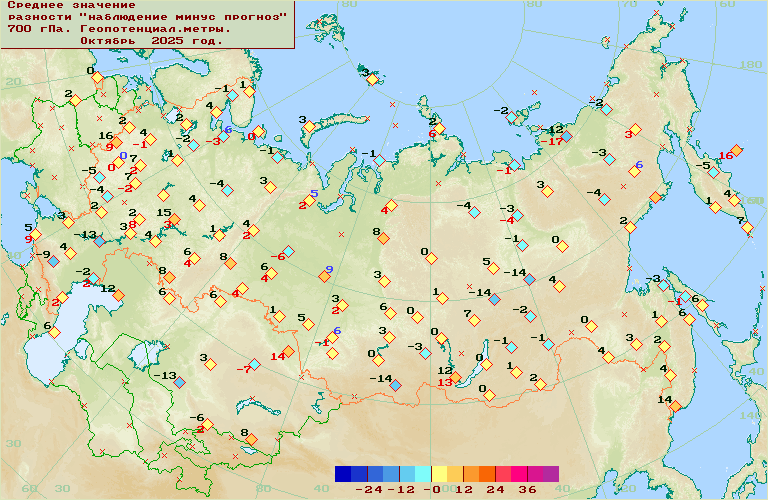 Cреднее значение "OB-FG". Геопотенциал. 700 гПа