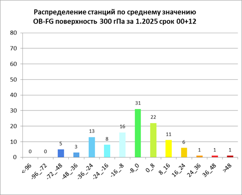 | Распределение станций по среднему значению OB-FG поверхность 300 гПа за 1.2025 срок 00+12 | |||||||||||||||||||