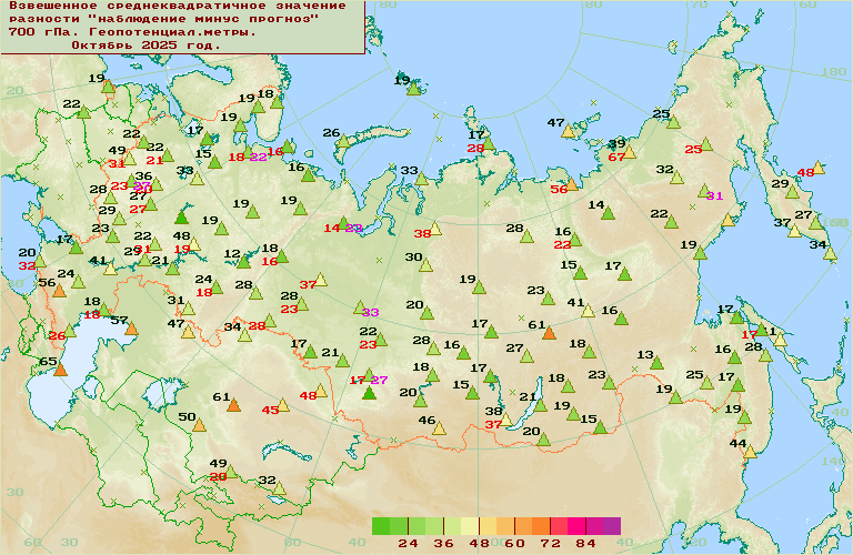 Взвешенное среднеквадратичное значение "OB-FG". Геопотенциал. 700 гПа