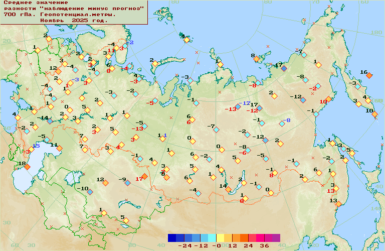 Cреднее значение "OB-FG". Геопотенциал. 700 гПа