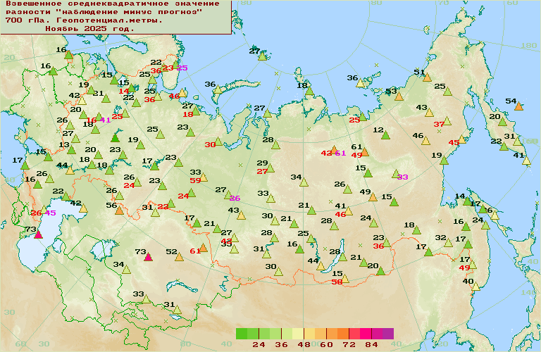 Взвешенное среднеквадратичное значение "OB-FG". Геопотенциал. 700 гПа