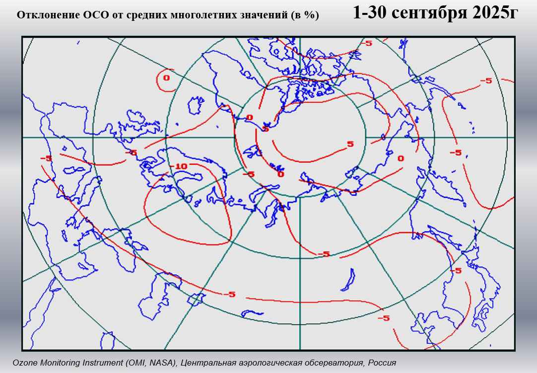Информация о распределении аномально низких значений общего содержания озона (ОСО) над территорией Российской Федерации по данным наземной озонометрической сети Росгидромета. Под аномально низкими суточными значениями общего содержания озона понимаются суточные значения ОСО, которые ниже климатической нормы на величину более чем 2,5 стандартного отклонения |