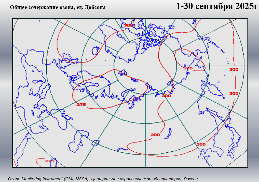Среднемесячные значения общего содержания озона в единицах Добсона над территорией Российской Федерации по данным наземной озонометрической сети Росгидромета и отклонения среднемесячных значений от климатической нормы в процентах (ежемесячно) |